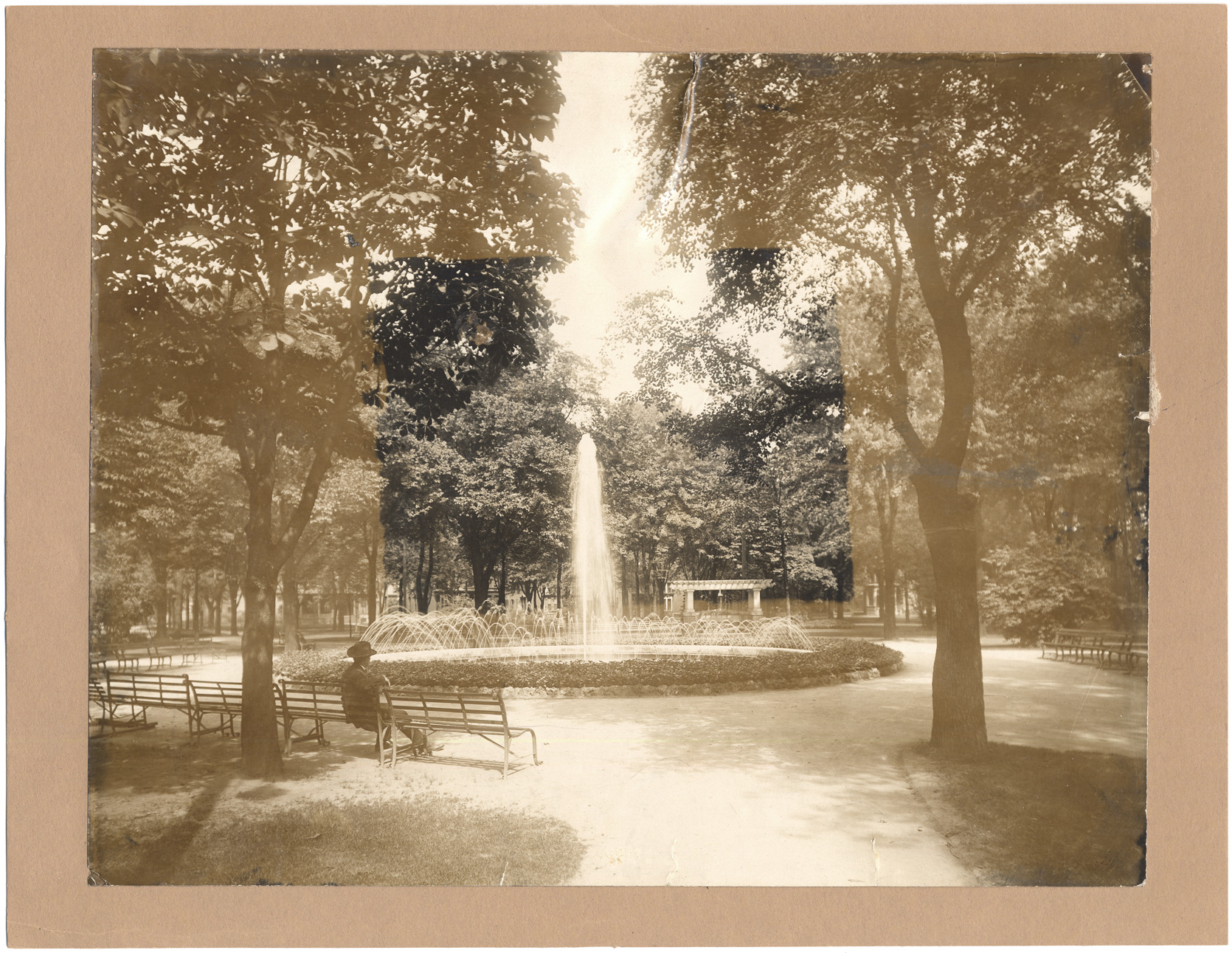 Favorite this☆ Fountain in Cass Park Description: Fountain in Cass Park in roundabout surrounded by benches. Man sits on bench; trees around and buildings in background. Handwritten on stock back: "50." Photograph irregularly faded, has small tear at edge. Details Resource ID: DPA3737 Subject: Parks--Michigan--Detroit Fountains--Michigan--Detroit Albumen prints Photographic prints Date Issued: Unknown year Format: 1 photographic print mounted on stock ; image 7.5 x 9.5 in. Member of: Burton Historical Collection Filing Location: D/Parks-Cass Note (Content): From the Farwell photograph album Rights: Physical rights are retained by DPL. Copyright is retained in accordance with U.S. copyright laws.
