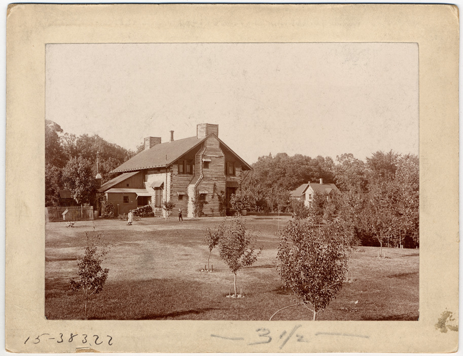 View of two-story log house with chimneys; man and woman stand in front. Handwritten on back: "Senator Thos. W. Palmer's log cabin house." Stamped on back: "E.H. Husher & Co."