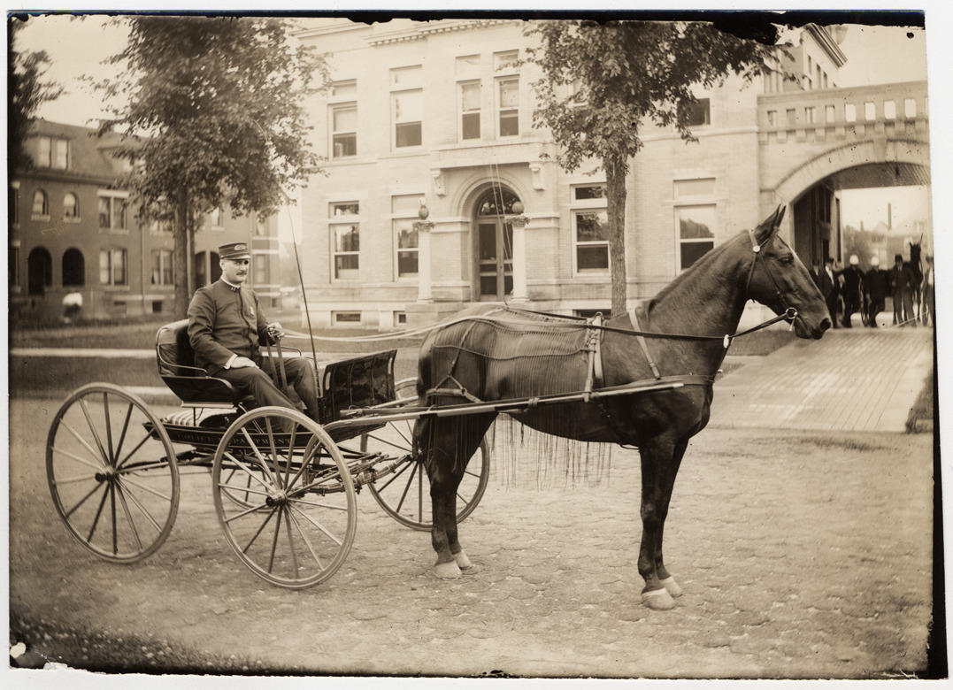 Police officer in uniform at reins of horse-drawn carriage, on unpaved road in front of 9th precinct building. Stamped on photograph back: "Sergeant Willard R. Leitzel, Detroit (Mich.) police department." Handwritten on photograph back: "In front of 9th Prec."