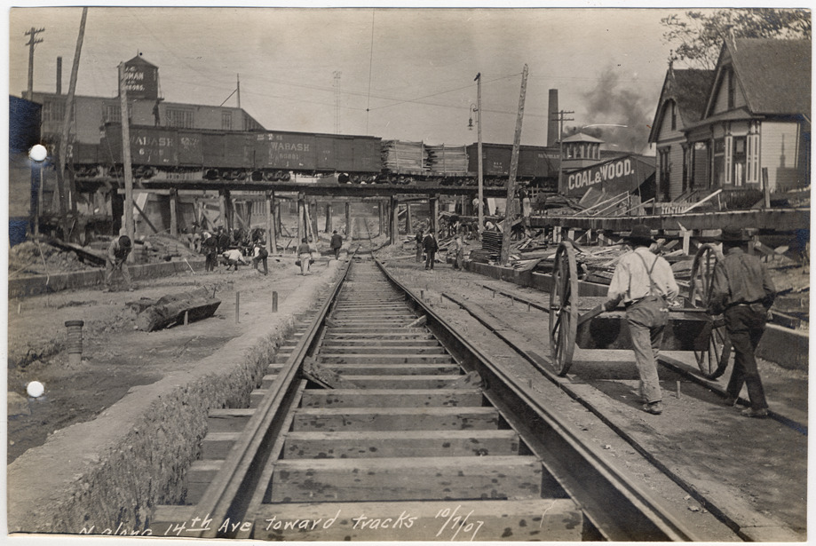View of men working along railroad tracks during construction of the Michigan Central Railroad. Two men push large two-wheeled cart; freight cars travel over bridge. Printed on front: "N. along 14th Ave. toward tracks, 10/7/07."