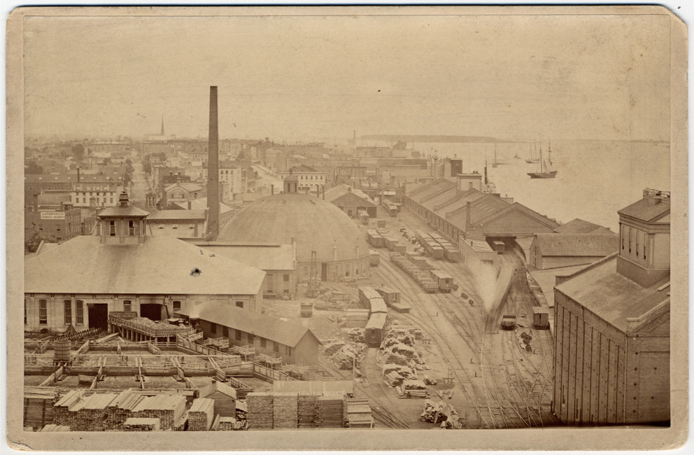 Michigan Central Railroad yard, with warehouses . Houses beyond; sailing ships on river. Typed on label on card back: "Michigan Central Depot Yard about 1868." Handwritten on card back: "Michigan Central Depot Yard about 1868. E709. 2 (in circle)."