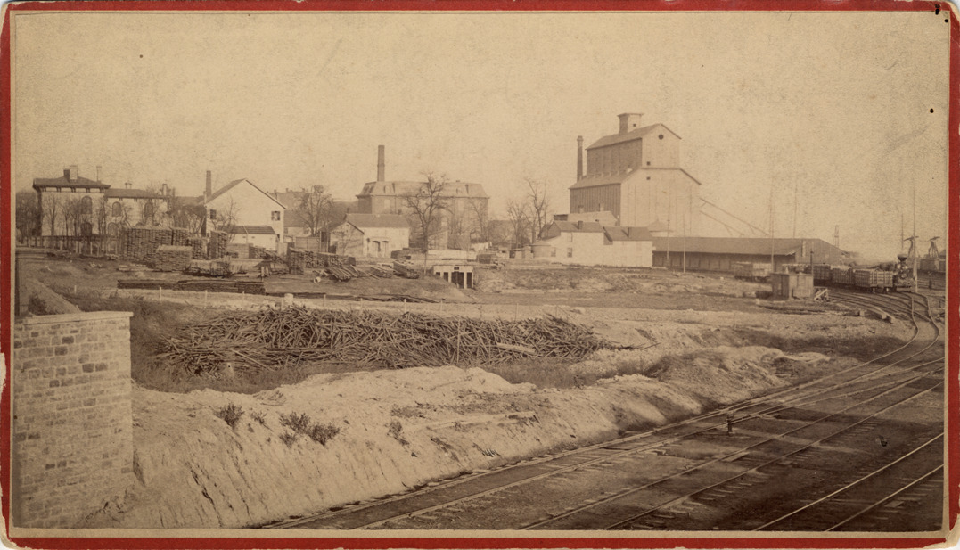 View along curved tracks to Michigan Central Railroad yard with warehouses. Piles of lumber and sticks. Printed on label on card back: "New series. Panoramic and cabinet sketches, in and about the city of Detroit. Photographed and published by Jex Bardwell, 31 Monroe Avenue." Edges of card worn.