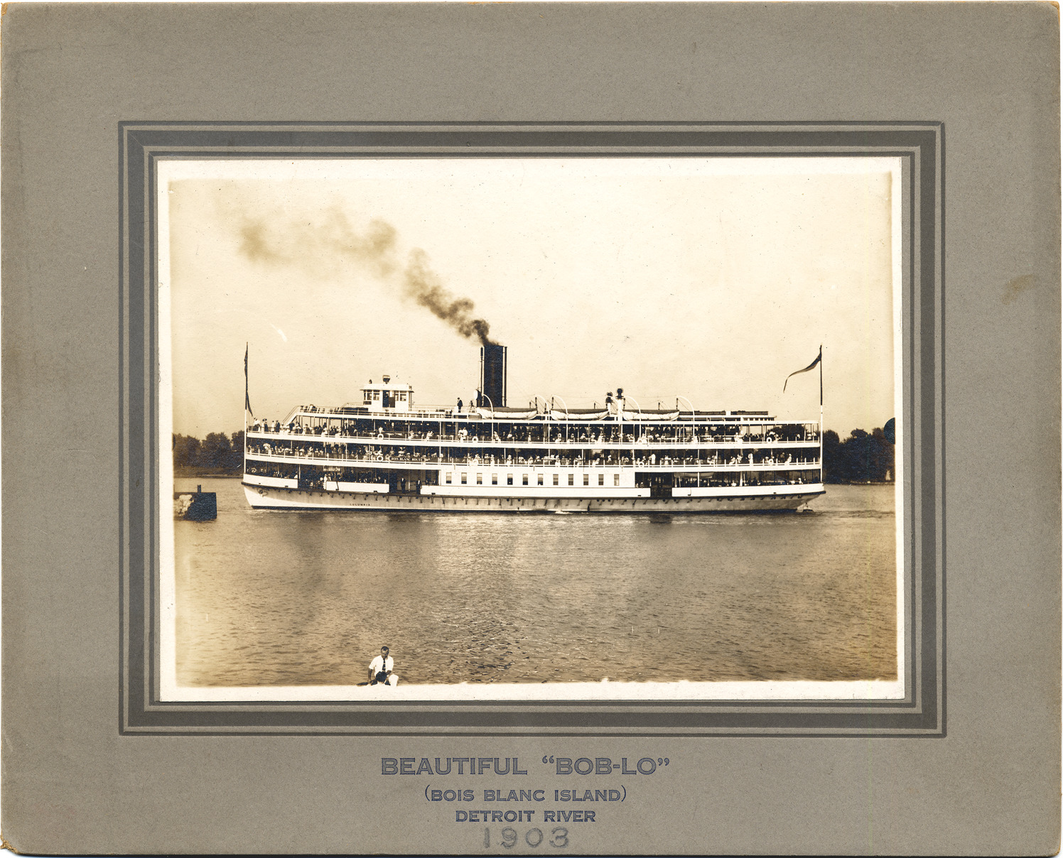 Favorite this☆ Bob-Lo ferry "Columbia" Description: View of the Bob-Lo ferry "Columbia" with passengers on deck. Printed on front: "Beautiful Bob-Lo (Bois Blanc Island), Detroit River, 1903 [sic, public decks were not added until 1911]." Handwritten on back: "Year 1903 [sic] at Bob-Lo." Details Resource ID: DPA3870 Subject: Ferries--Michigan--Detroit Excursion boats--Michigan--Detroit Columbia (Ship : 1902- ) Detroit River (Mich. and Ont.) Photographic prints Date Issued: 1911 (year approximate) Format: 1 photographic print mounted on mat board ; image 5 x 7 in. Member of: Burton Historical Collection Filing Location: D/River-Islands-Bois Blanc (Bob-Lo) Rights: Physical rights are retained by DPL. Copyright is retained in accordance with U.S. copyright laws.