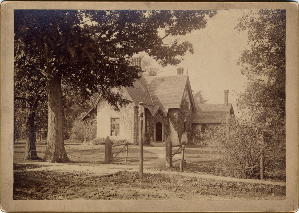View of vine-covered Gothic revival house. Handwritten on back: "Home of Judge Samuel Townsend Douglas, Grosse Ile, Michigan, built 1860. A sister, Elizabeth Douglas married James Valentine Campbell, father of Edward de Mill Campbell. Daughters, Mary Douglas Anderson, died Grosse Ile. Elizabeth Campbell Douglas Hall, died 1955 at Ann Arbor. Architect - Mr. Gordon Lloyd, Englishman." Label on back: "Photographic sketches in and around the city of Detroit, consisting of street and marine views, public buildings, churches, monumental and other objects of interest, no. 500, photographed and published by Jex Bardwell."