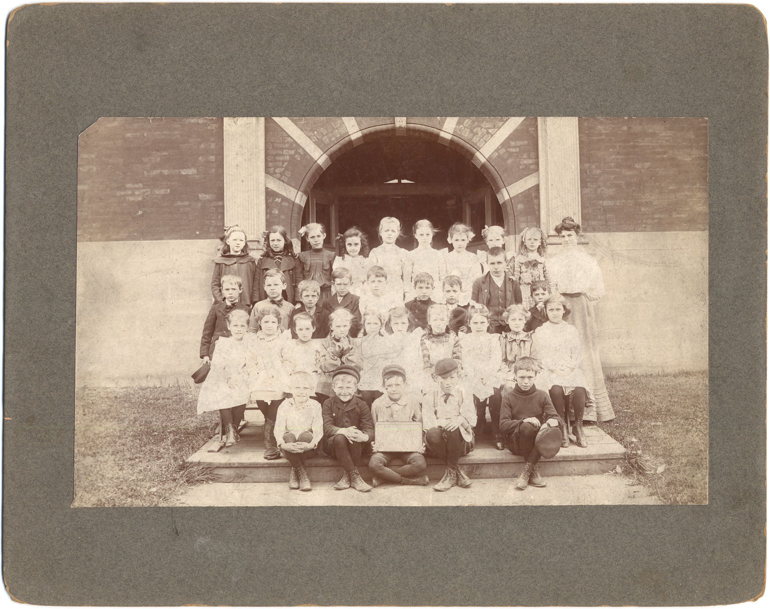 Students and teacher posed in front of arched entrance to brick school building. Boy in front center holds signboard. Handwritten on mat back: "Amos School, Detroit. Top row - 1st on left end - Lillian R. Campbell (finished 8th grade June 25, 1909)." Corners of mat worn and rounded; photograph corner torn off and left edge cut unevenly.