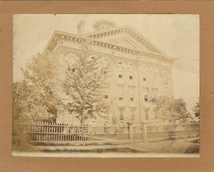 Neoclassical brick school building with pediment and cupola, viewed at an angle from road. Signs on building read: "1858. Bishop Union School." Does not include wings on each end that are in 1881 picture. Picket fence and trees. Handwritten on stock back: "Marion between Hastings & Prospect."