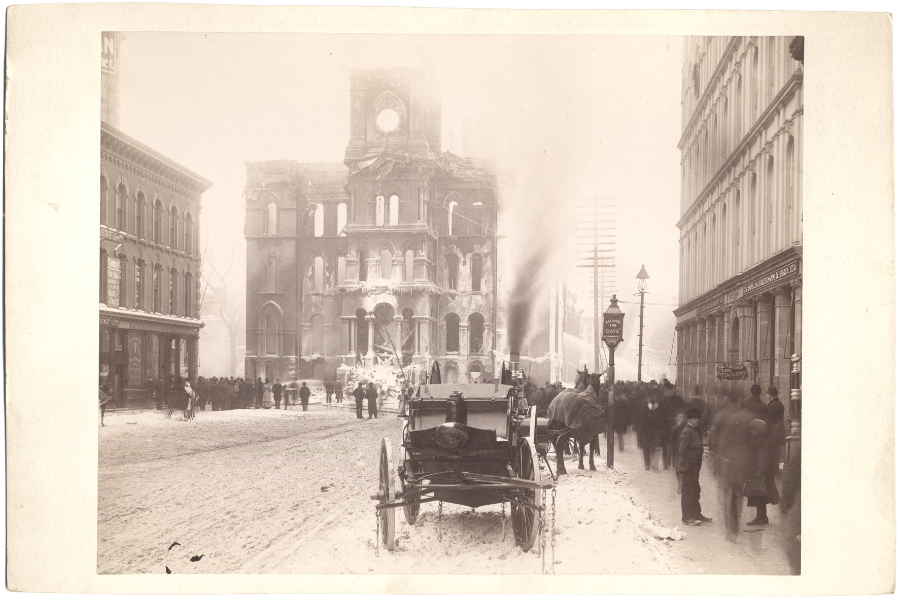 Group of spectators gather outside of burned building on snow-covered streets and sidewalks; icicles hang from building; pile of debris at entrance; horse-drawn wagon in foreground; part of fire engine visible near building. Stamped on back: "From Alvord & Co., exclusively commercial photographers, 55 Rowland St., Detroit, Mich., ground floor."