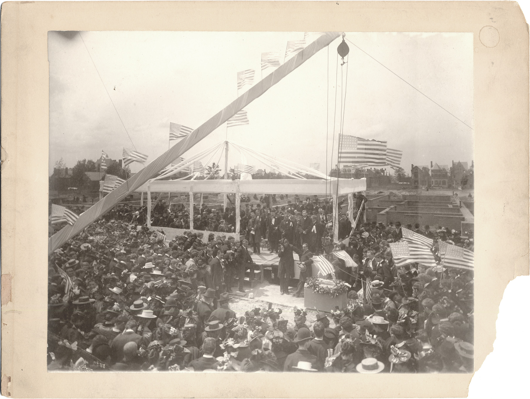 Crowd viewing cornerstone-laying ceremony for Central High School on May 13th, 1895. Large block, decorated with wreath, attached to pulley. Pavilion decorated with flags; building foundation in background. Stamped on back: "W. H. Gardiner, photographer, Detroit and Mackinac Island."