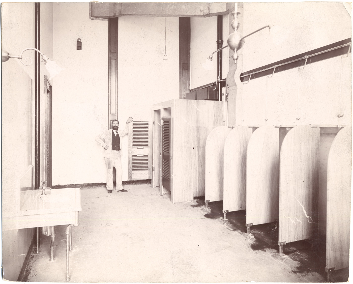 View of lavatory with stalls, showers and sink; man holds stall door open. Stamped on back: "A. Godfrey & Co., commercial photographer, 41 W. Fort Street, Detroit, Mich."