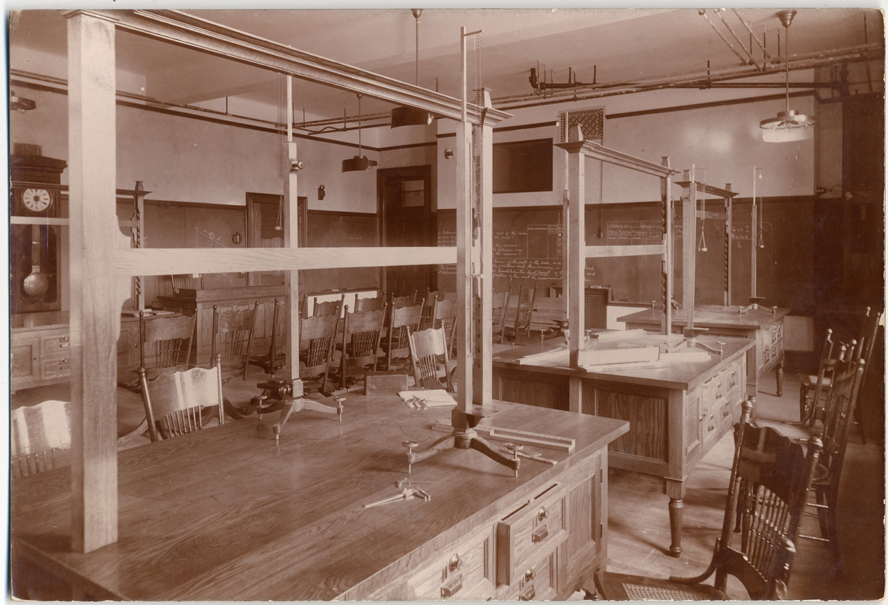 Favorite this☆ Classroom at Central High School Description: View of classroom with tables and chairs; apparatus with small weights on each table; calipers and measuring devices. Handwritten on back: "Physical Laboratory." Details Resource ID: DPA3957 Subject: Classrooms--Michigan--Detroit High school buildings--Michigan--Detroit Photographic prints Date Issued: 1897 Format: 1 photographic print mounted on mat board ; image 5.75 x 8.5 in. Member of: Burton Historical Collection Filing Location: D/Schools-Central High, 1897 Rights: Physical rights are retained by DPL. Copyright is retained in accordance with U.S. copyright laws.