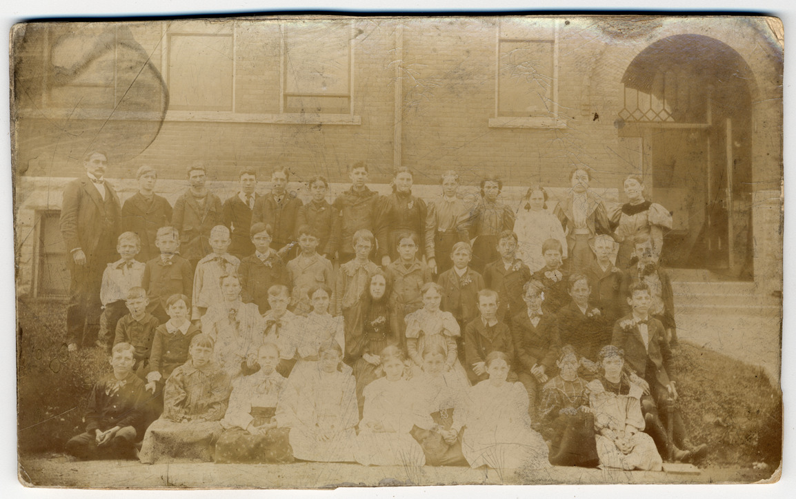 Favorite this☆ Higgins School class picture Description: Class picture of older students of various ages, posing outside entrance to Higgins School. Male teacher standing in upper left corner of group. Details Resource ID: DPA3969 Subject: Students--Michigan--Detroit Teachers--Michigan--Detroit Portraits, Group--Michigan--Detroit Photographic prints Date Issued: Unknown year Format: 1 photographic print mounted on mat board ; image 4.5 x 7.5 in. Member of: Burton Historical Collection Filing Location: D/Schools-Higgins Rights: Physical rights are retained by DPL. Copyright is retained in accordance with U.S. copyright laws.