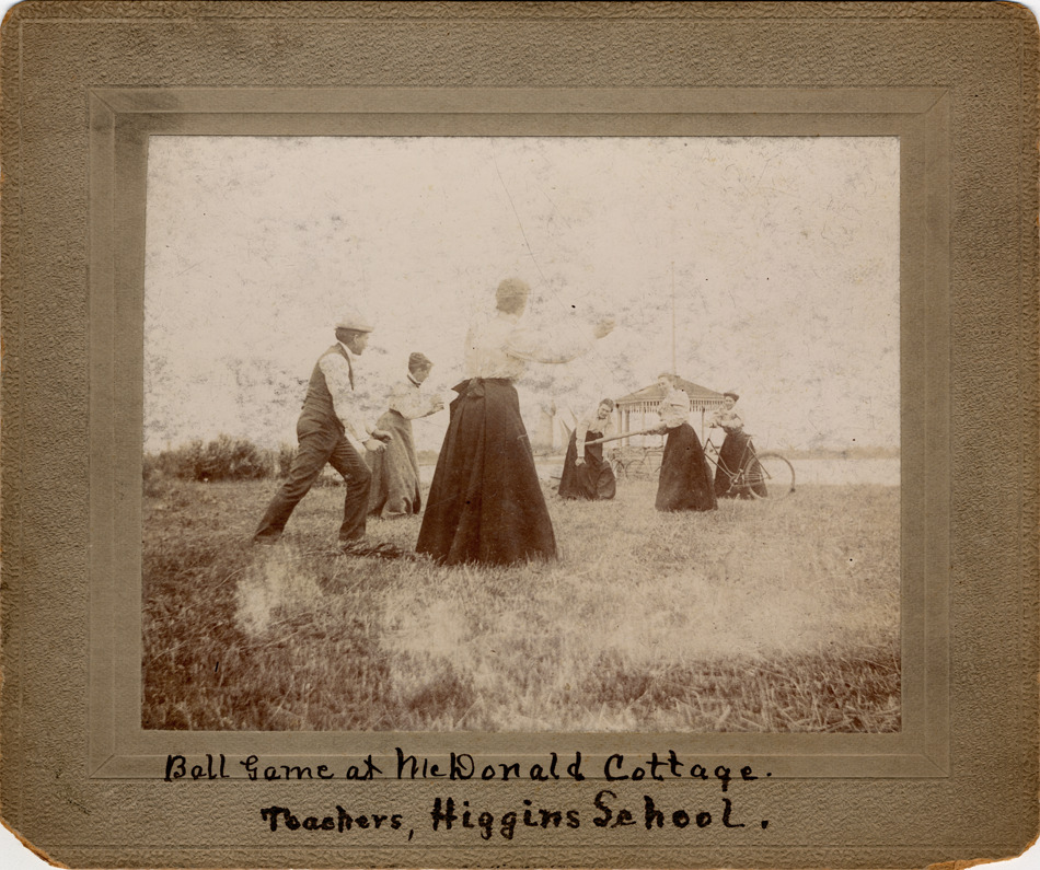 Favorite this☆ Higgins School teachers at McDonald Cottage Description: Several women and one man play stickball or baseball in a field; gazebo in background; one woman stands with bicycle. Handwritten on front: "Ball game at McDonald Cottage; teachers at Higgins School." Details Resource ID: DPA3978 Subject: Ball games--Michigan--Detroit Teachers--Michigan--Detroit Photographic prints Date Issued: Unknown year Format: 1 photographic print mounted on mat board ; image 3.75 x 4.75 in. Member of: Burton Historical Collection Filing Location: D/Schools-Higgins Rights: Physical rights are retained by DPL. Copyright is retained in accordance with U.S. copyright laws.