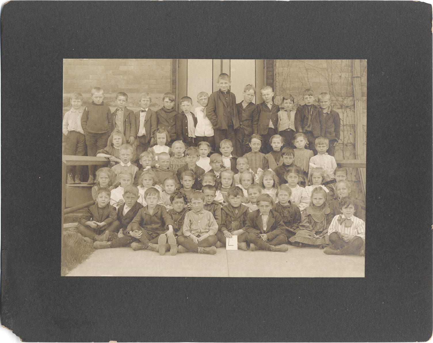 Students posed against entrance of Higgins School, mixture of girls and boys. Child in front holding sign of letter "L."