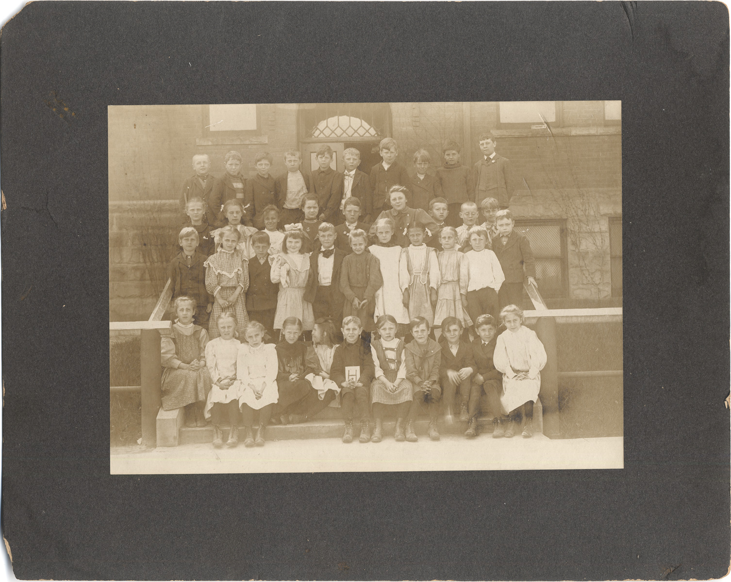 Favorite this☆ Higgins School class picture Description: Students posed against entrance of Higgins School, mixture of girls and boys. Child in front holding sign of letter "H." Details Resource ID: DPA3981 Subject: School children--Michigan--Detroit Portraits, Group--Michigan--Detroit Photographic prints Date Issued: Unknown year Format: 1 photographic print mounted on mat board ; image 5 x 7 in. Member of: Burton Historical Collection Filing Location: D/Schools-Higgins Rights: Physical rights are retained by DPL. Copyright is retained in accordance with U.S. copyright laws.