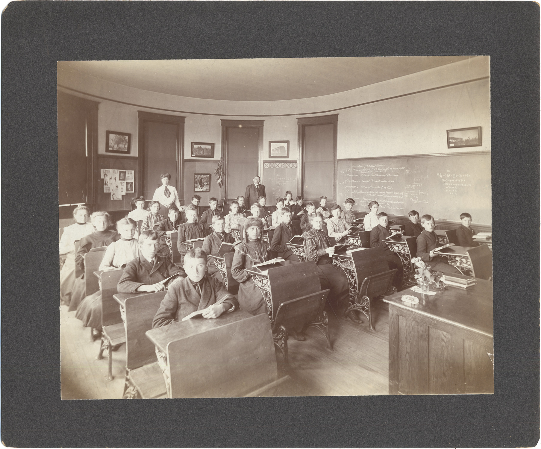 Favorite this☆ Classroom at Higgins School Description: Students seated at desks; two teachers stand in back of classroom. Written on blackboard: "Formations of political parties." Details Resource ID: DPA4002 Subject: Students--Michigan--Detroit Classrooms--Michigan--Detroit Teachers--Michigan--Detroit Albumen prints Photographic prints Date Issued: Unknown year Format: 1 photographic print mounted on mat board ; image 7.5 x 9.5 in. Member of: Burton Historical Collection Filing Location: D/Schools-Higgins Rights: Physical rights are retained by DPL. Copyright is retained in accordance with U.S. copyright laws.