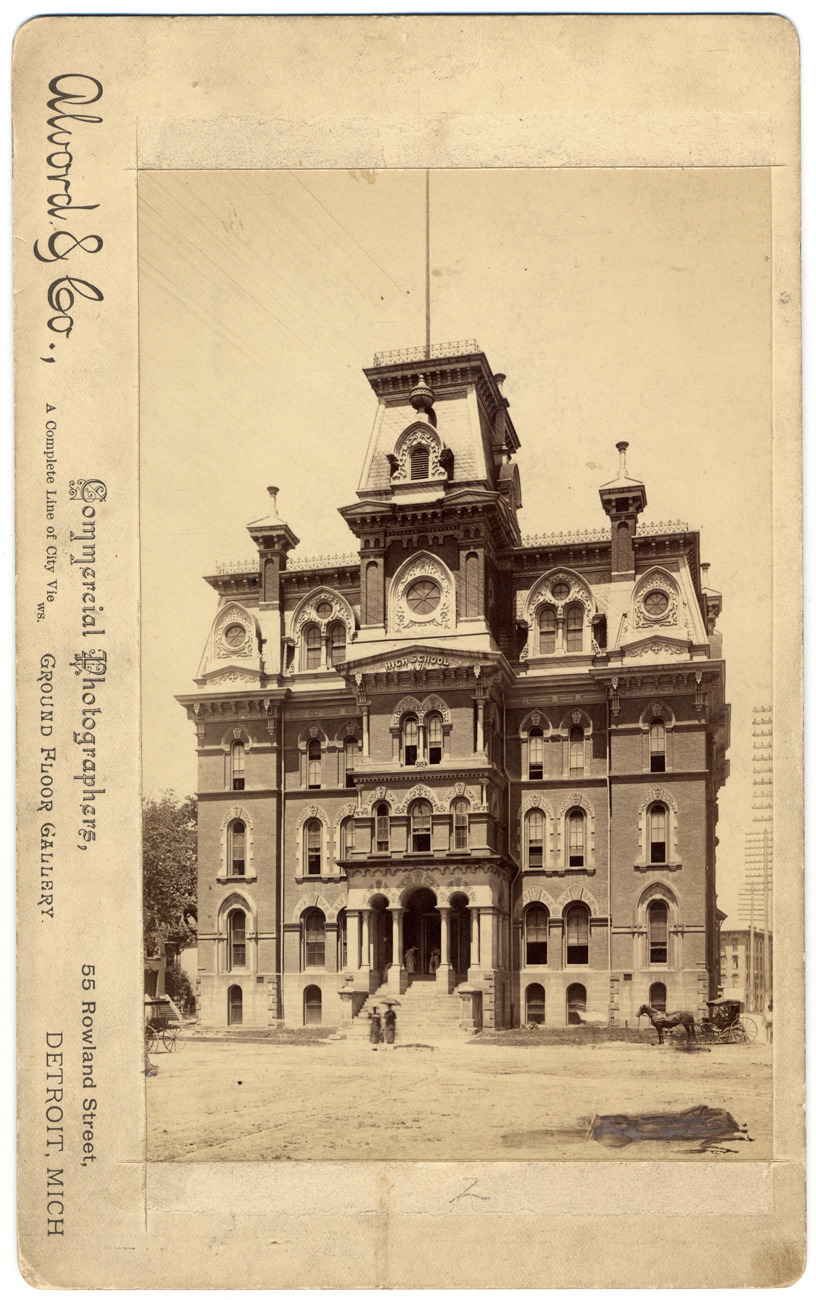 Capitol High School, located in the State Capitol Building at Griswold and State. Second Empire style building, with decorative woodwork and brickwork around windows; square tower at front. "High School" carved in front. Printed on front: "Alvord & Co., commercial photographers, a complete line of city views, ground floor gallery, 55 Rowland Street, Detroit, Mich." Handwritten on back: "High School monstrosity."