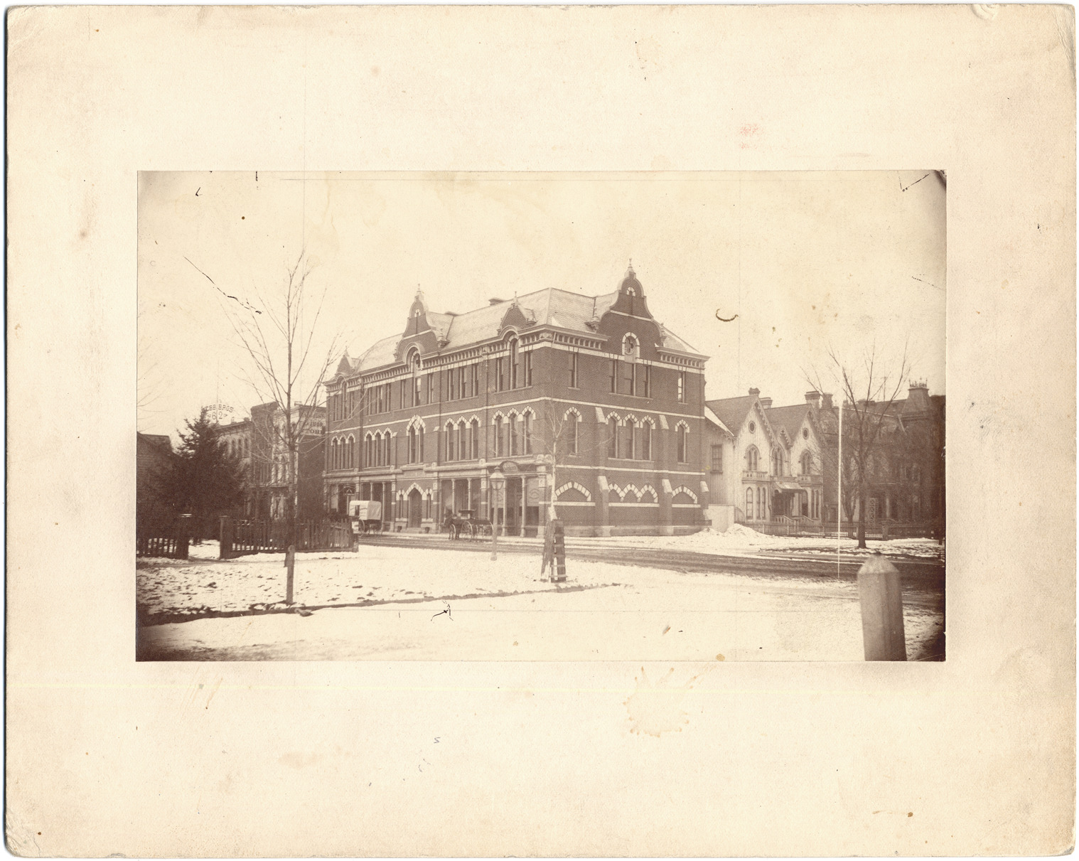 Three-story brick building, with decorative brickwork around windows. Located in business neighborhood, snow covers ground. Handwritten on back: "1881, Industrial School." Label on back: "Second Industrial School building, on the corner of Grand River and Washington Boulevard, yet standing."