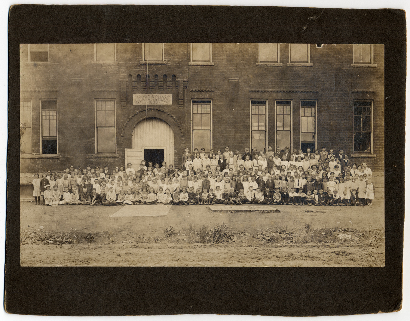 Large group of students and teachers posed in front of brick school building. Sign on building reads: "Lonyo School, 1898." Handwritten on mat back: "Detroit Lonyo School, 1905. Near Buchanan St. in Detroit. Mrs. Julia Weller, 34136 Caspian, Westland, MI 48185."