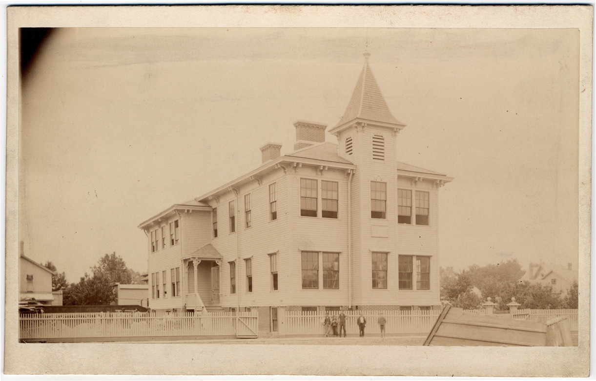 Two-story clapboard Second Empire building with central tower, viewed at an angle from street. Five children in front of picket fence. Handwritten on mat back: "Nichols School, 1882. Elm St. bet. 7th and Trumbull."