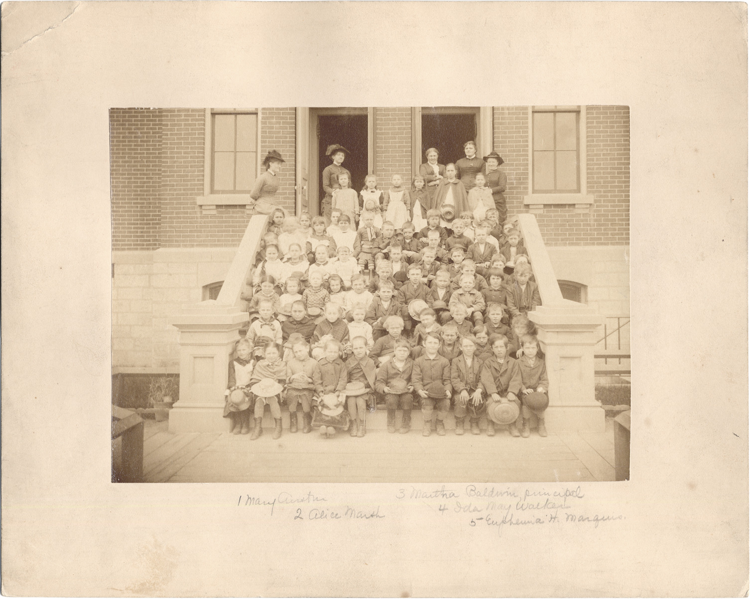 Students and teachers posed on steps in front of brick school building. Handwritten on mat front: "1. Mary Austin; 2. Alice Marsh; 3. Martha Baldwin, principal; 4. Ida May Walker; 5. Euphemia H. Marquis." Handwritten on mat back: "Detroit Norvell School about 1885."