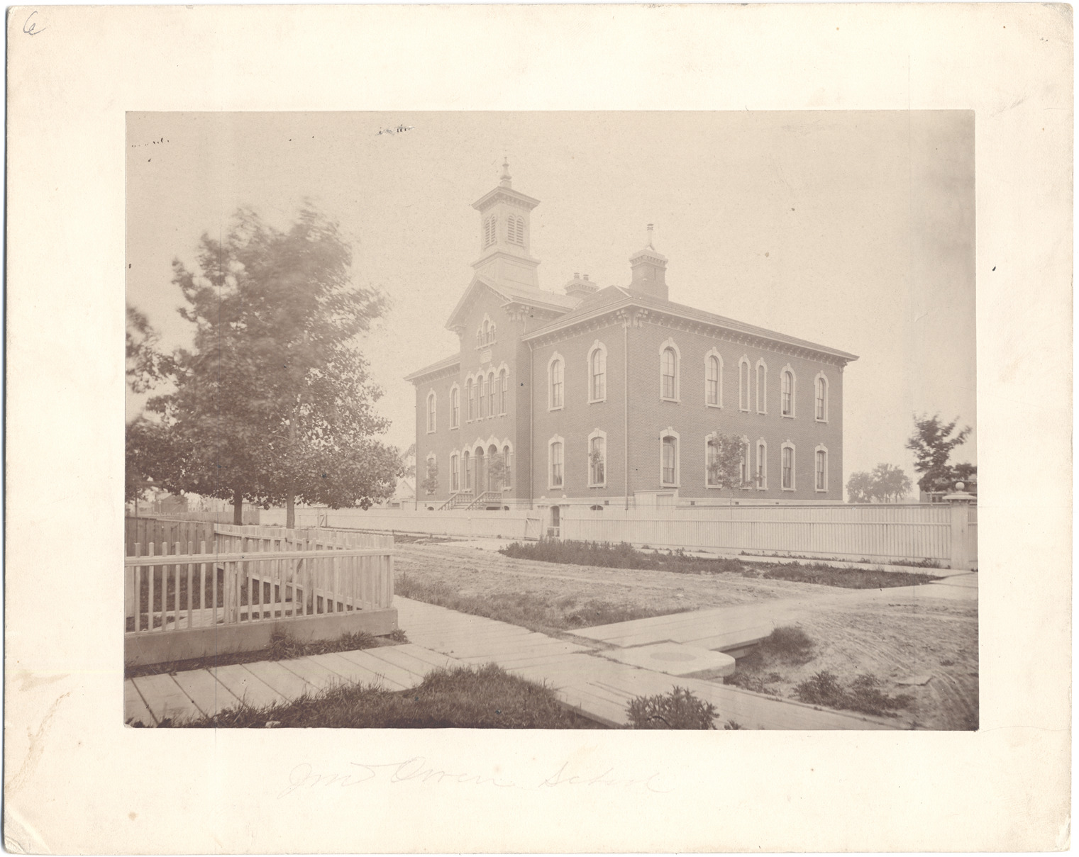 Brick Second Empire school building with two wings off small central block; cupola and chimney stacks. Viewed at an angle across unpaved road and wooden sidewalks. Houses visible behind. Handwritten on mat front: "John Owen School." Handwritten on mat back: "John Owen School. Cor. 13th & Myrtle Sts. About 1881."