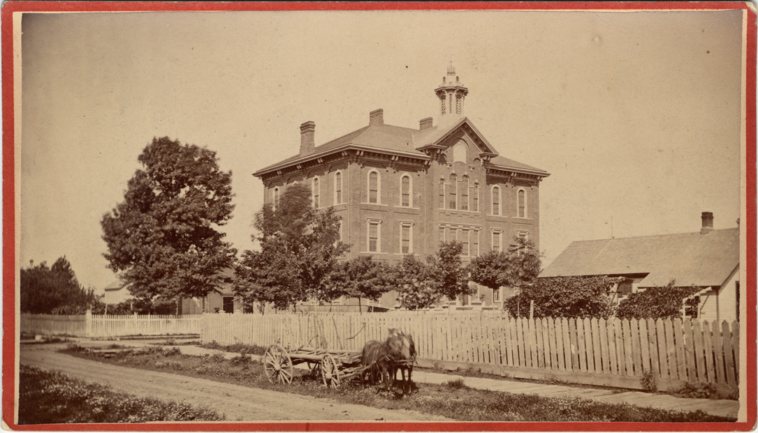 Brick Second Empire school building with two wings off small central block; cupola and chimney stacks. Viewed at an angle across unpaved road and wooden sidewalks. Horse-drawn wagon by road. Handwritten on card back: "Pitcher School, 1882. Sullivan Ave. near Michigan."