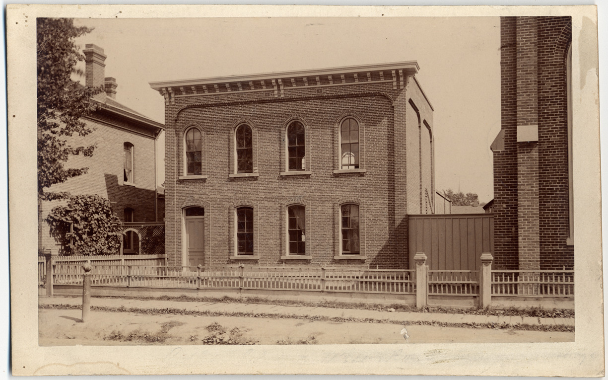 View of small two-story brick building with arched windows; fence in front. Handwritten on back: "St. Paul's Second German Evangelical School, 1882, 17th & Rose."