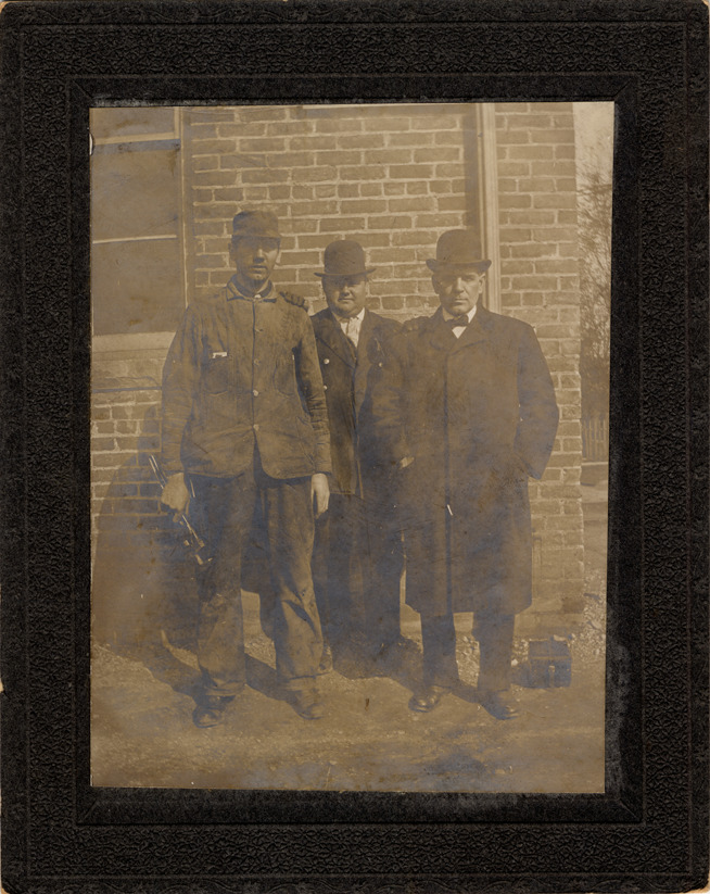 Favorite this☆ Men standing outside building Description: Three men pose outside brick building; one man is wearing work clothes and holds a wrench; two other men wear overcoats and hats. Details Resource ID: DPA4094 Subject: Railroads--Employees Men--Michigan--Detroit Photographic prints Date Issued: Unknown year Format: 1 photographic print mounted on mat board ; image 4.25 x 3.25 in. Member of: Burton Historical Collection Filing Location: D/Street railroads Rights: Physical rights are retained by DPL. Copyright is retained in accordance with U.S. copyright laws.