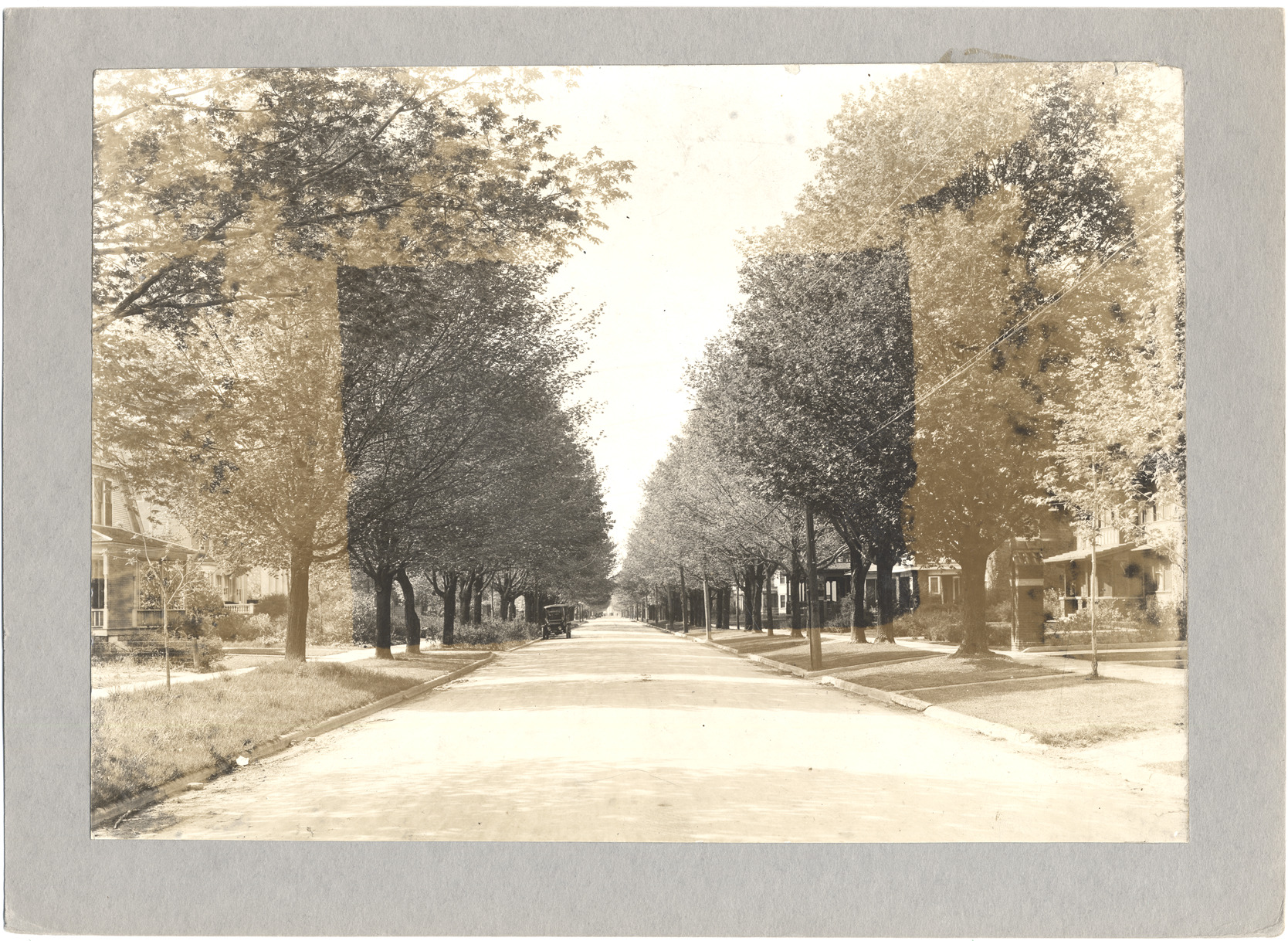 View down unidentified street. Houses line each side, large trees grow along sidewalk. Car parked farther down road.
