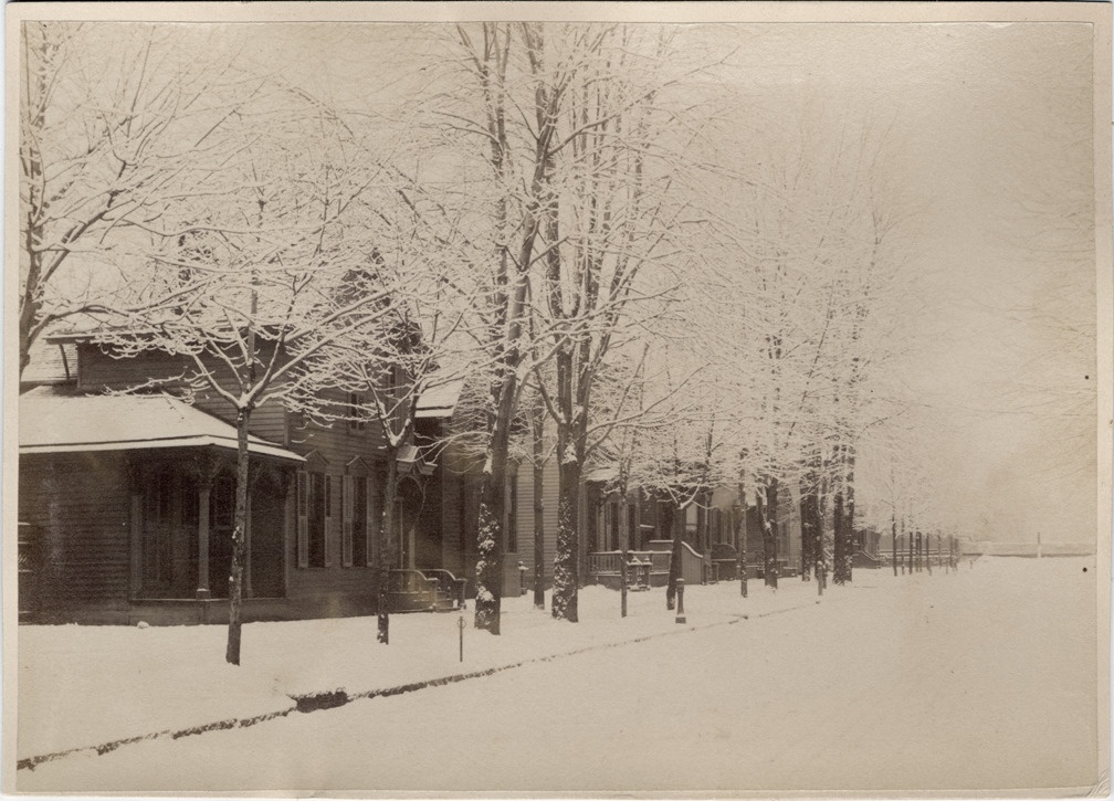Houses lining unidentified street, trees growing along sidewalk. Deep snow covers ground.