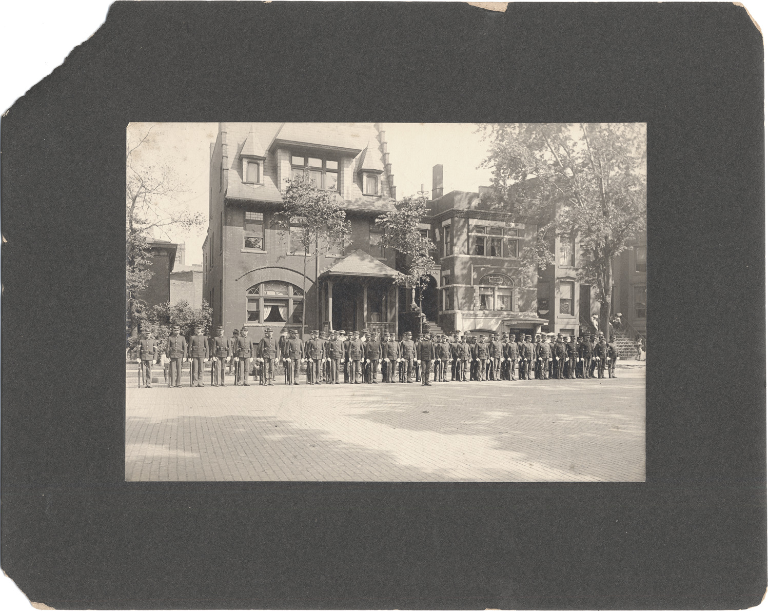 Line of Civil War soldiers in uniform, outside 21 Bagley Street. Printed on back: "Kerr, photographer. 247 Jefferson Ave., Detroit, Mich. Outdoor work a specialty. Orders by mail receive prompt attention." Handwritten on back: "21 Bagley Ave., Detroit, Michigan."