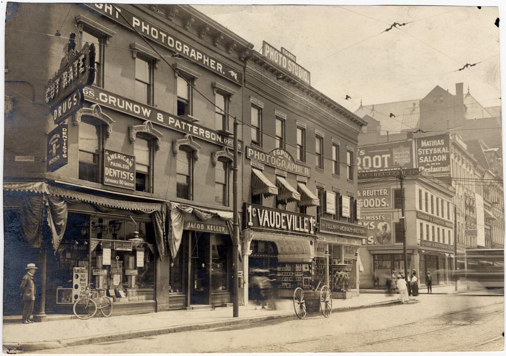 View along Randolph looking away from Gratiot. Handwritten on photograph back: "Taken by F.G. Poli." Photograph removed from album; glue and paper still on back.