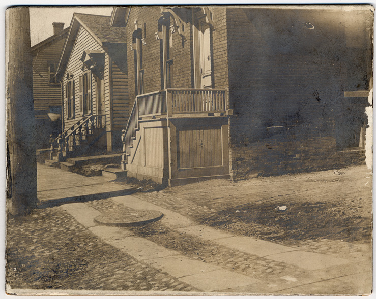 View across paved crossing on cobbled street, with utility hole cover, leading to wooden sidewalk in front of houses. Handwritten on back: "Apr. 10 1902. Alfred Davis. Brooklyn Ave. East side between Howard & Abbott. F.S.Q." Photograph and mat worn at edges.