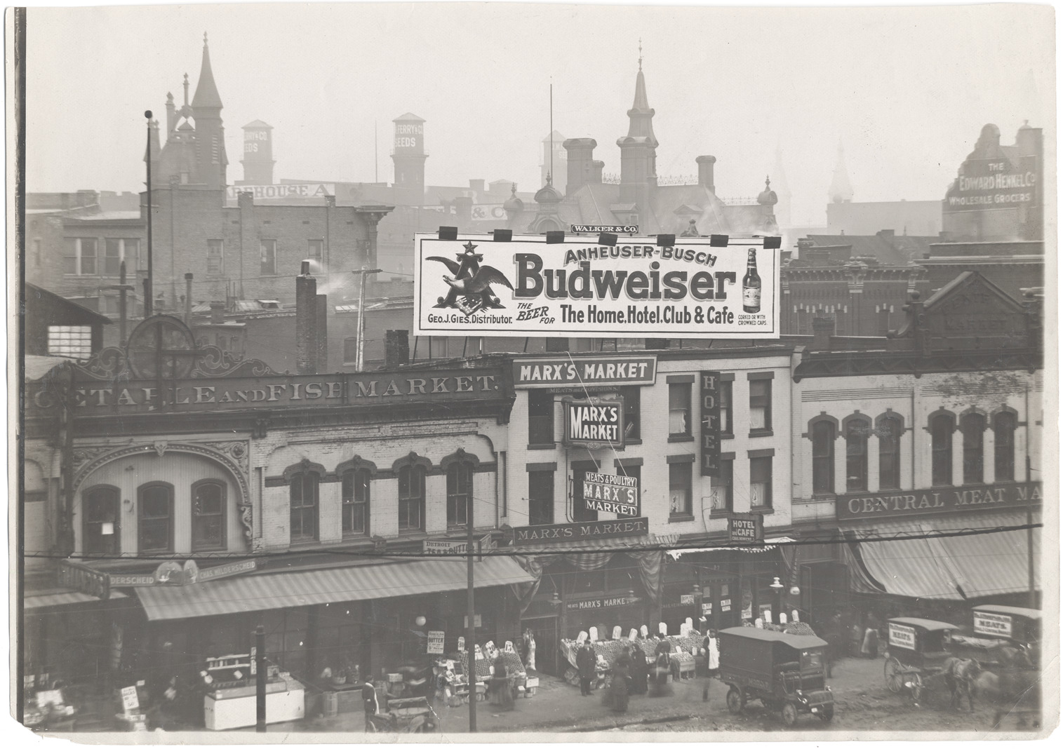 View from a height across Cadillac Square. Horse-drawn carriages and trucks; multiple pedestrians. Signs include [Central] Vegetable and Fish Market, Marx's Market, Central Meat Market. Signs in streets behind include The Edmund Henkel Co. wholesale grocers and Ferry & Co. seeds. Walker & Co. billboard for Anheuser-Busch Budweiser. Handwritten on photograph back: "Cadillac Square, c.1900. #1918." Photograph has broken corners.