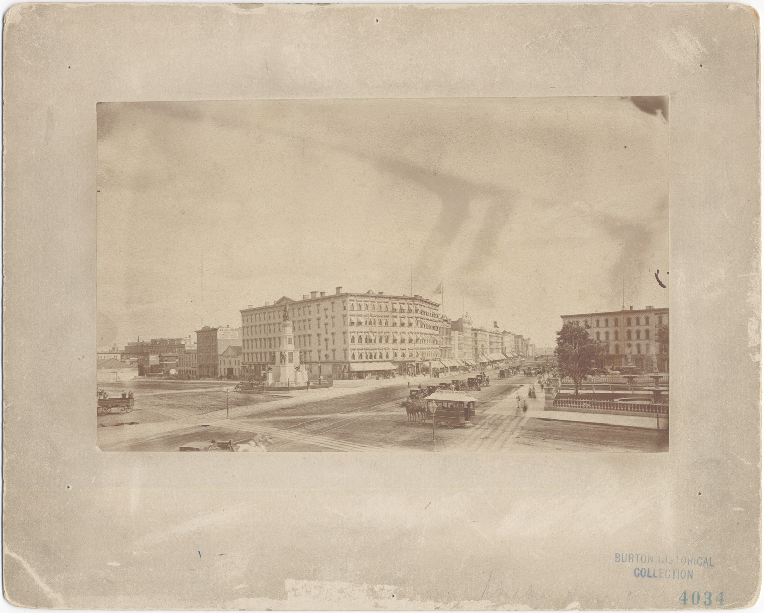 View along Cadillac Square past the Soldiers' and Sailors' Monument. Horse-drawn carriages and wagons; multiple pedestrians; horse-drawn streetcar along Woodward. Signs include J.S. Lauder, oil and wine importer. Stamped on mat front: "4034." Typed on label on mat back: "Cadillac Square [corrected from Campus Martius], looking south on Woodward, in the summer of 1894." Handwritten on mat back: "Cadillac Square, formerly Michigan Grand Ave. 1894. Russell House Hotel. Wood[?] ground. 678. 112." Mat and photograph worn.