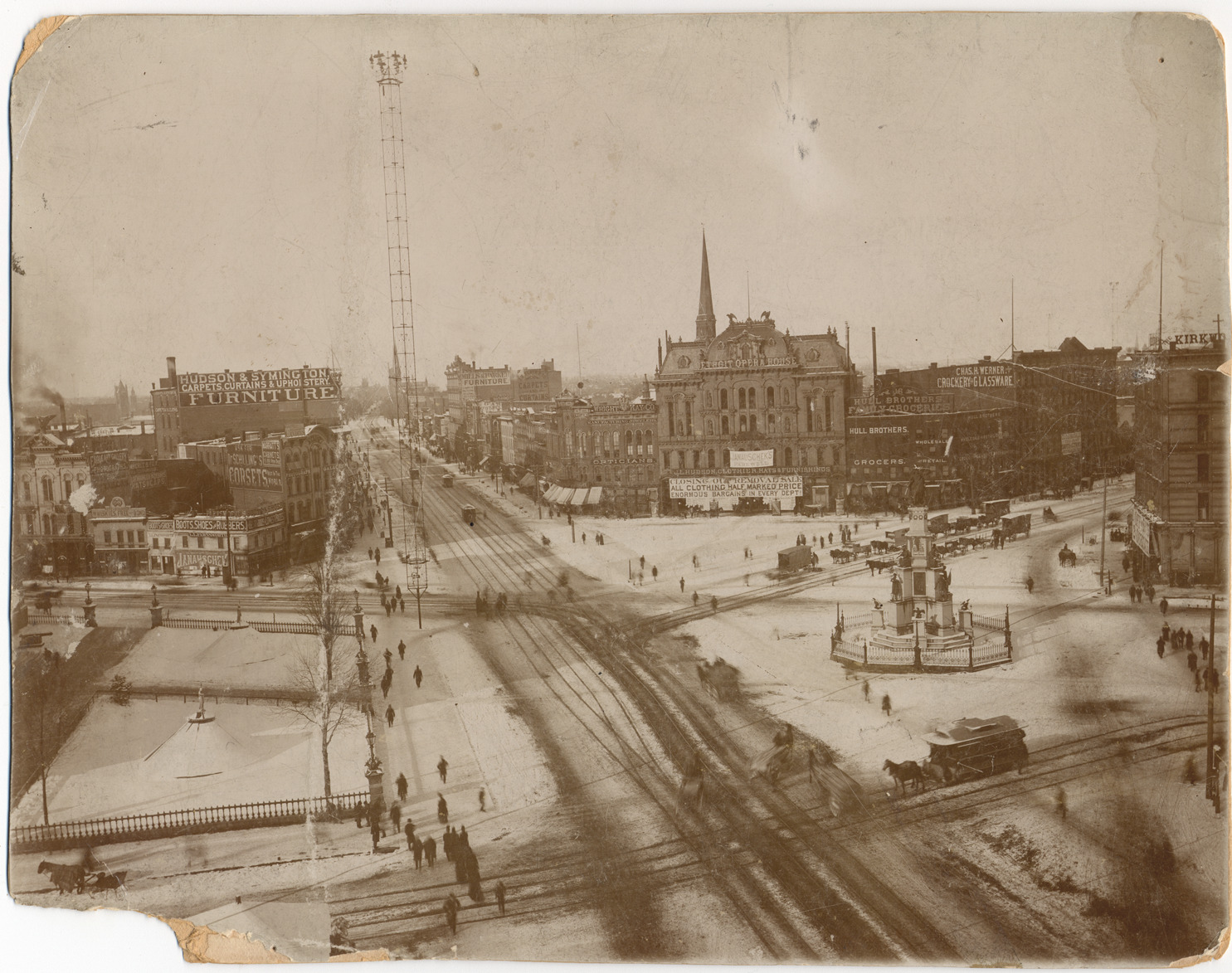 View from upper floor across Campus Martius with Soldiers' and Sailors' Monument and park. Horse-drawn carriages, wagons, and trucks; horse-drawn and motorized streetcars; snow on ground; fountains covered. Signs include Hudson & Symington, Farnsworth's, Mills & Barker, H. Black & Co., Wright & Kay Co., J.L. Hudson clothiers, Hull Bros. grocers, Chas. H. Werner crockery & glassware. Handwritten on cardboard back: "1890. Jahanschek appeared at the Detroit Opera House Feb. 27-29, 1890, also 1897. J.L. Hudson bought Presbyterian Church 1890. City Hall fence torn down 1891." Corners worn and broken on photograph and cardboard.