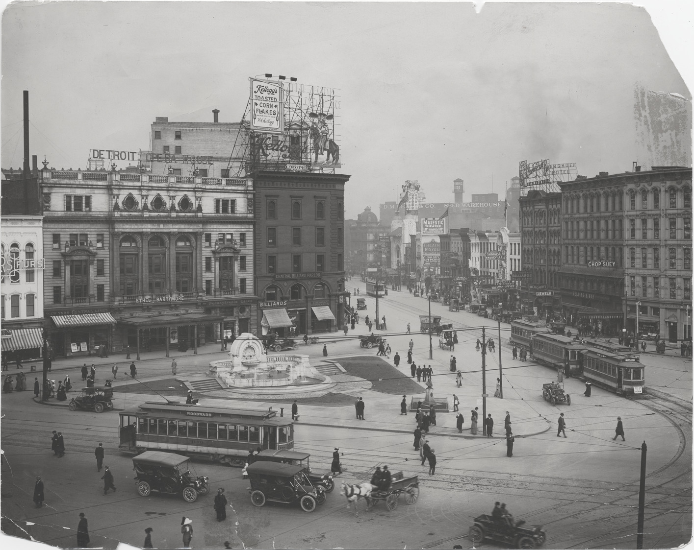 View across Campus Martius of Detroit Opera House block and other businesses. Signs include New York Central Line; Central Billiard Parlor; D.N. Ferry & Co. seed warehouse; Majestic Theatre; Berghoff Hotel; Chinese Imperial Chop Suey. Billboard for Kellogg's Toasted Corn Flakes. Cars and horse-drawn wagons; streetcars; fountain in triangular park. Handwritten on photograph back: "Campus Martius, c.1920. 4162. MD." Photograph edges frayed.