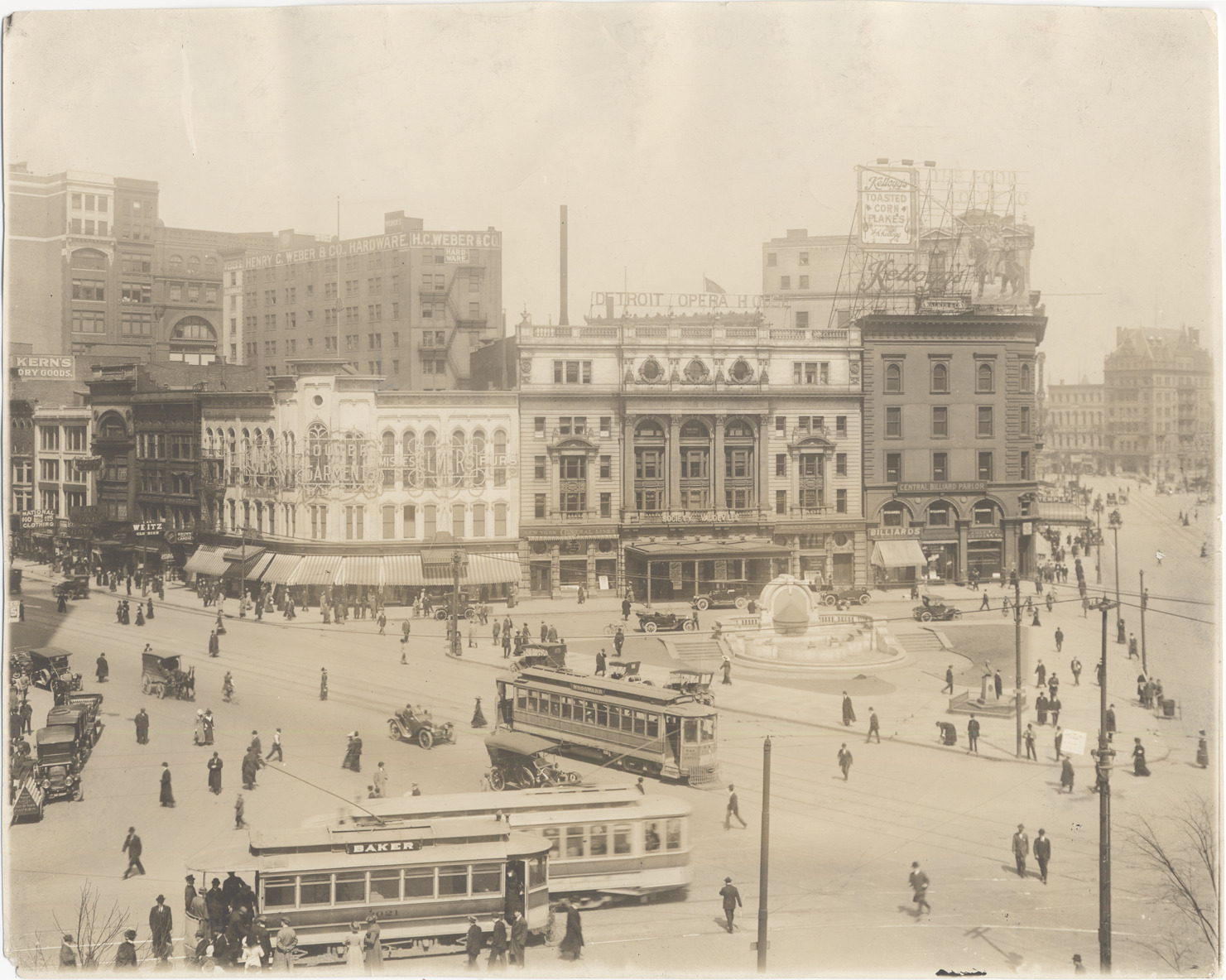 View across Campus Martius of Detroit Opera House block and other businesses. Signs include Elmer's furs; New York Central Line; Central Billiard Parlor; Ernst Kern's dry goods; L. & N. Weitz clothier; H.C. Weber & Co. hardware. Billboard for Kellogg's Toasted Corn Flakes. Cars and horse-drawn trucks; streetcars; fountain in triangular park. Handwritten on photograph back: "Campus Martius, about 1909." Photograph edges frayed.