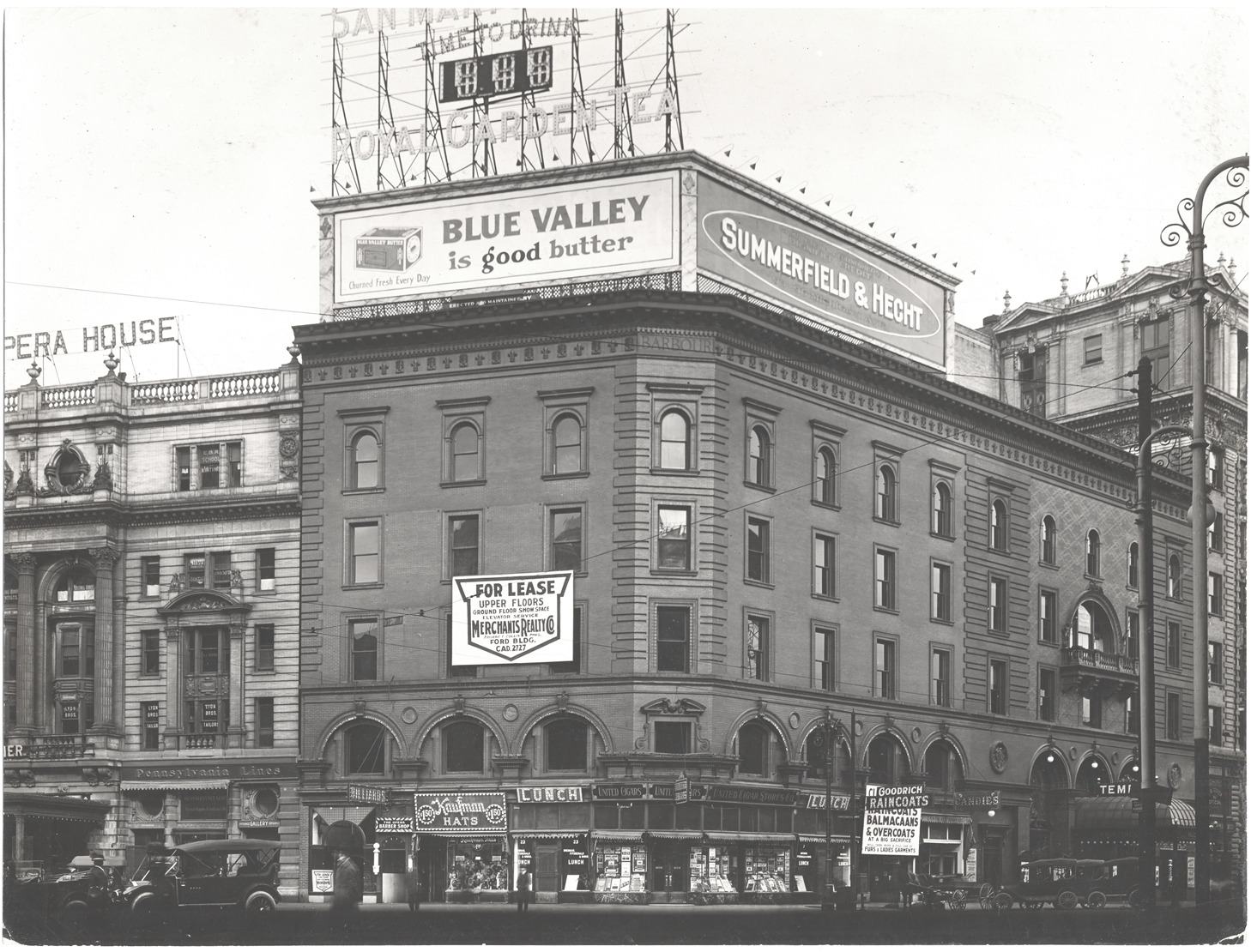 View across Campus Martius at Monroe. Part of Detroit Opera House on left edge, Barbour Building on corner. Signs include Pennsylvania Lines; the Opera barber shop; Kaufman hats; United cigars; Goodrich raincoats; Central Candy Co. Billboards for Blue Valley butter, Royal Garden tea, and Summerfield & Hecht. Handwritten on photograph back: "Campus Martius at Monroe. 1920 or 21."