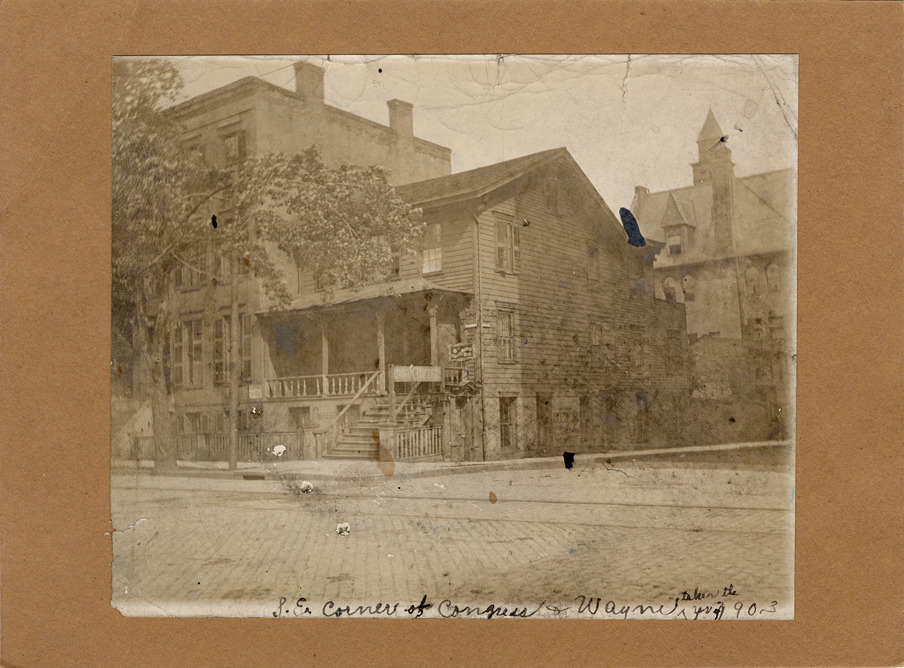 Favorite this☆ Wayne Street and Congress Street Description: Small two-story clapboard house with large front porch, next to four-story brick house, church in background. Handwritten on front: "S.E. corner of Congress & Wayne, taken the year of 1903." Details Resource ID: DPA4200 Subject: Wooden-frame houses--Michigan--Detroit Brick houses--Michigan--Detroit Streets--Michigan--Detroit Photographic prints Date Issued: 1903 Format: 1 photographic print mounted on stock ; image 4 x 4.5 in. Member of: Burton Historical Collection Filing Location: D/Streets-Congress & Wayne Rights: Physical rights are retained by DPL. Copyright is retained in accordance with U.S. copyright laws.