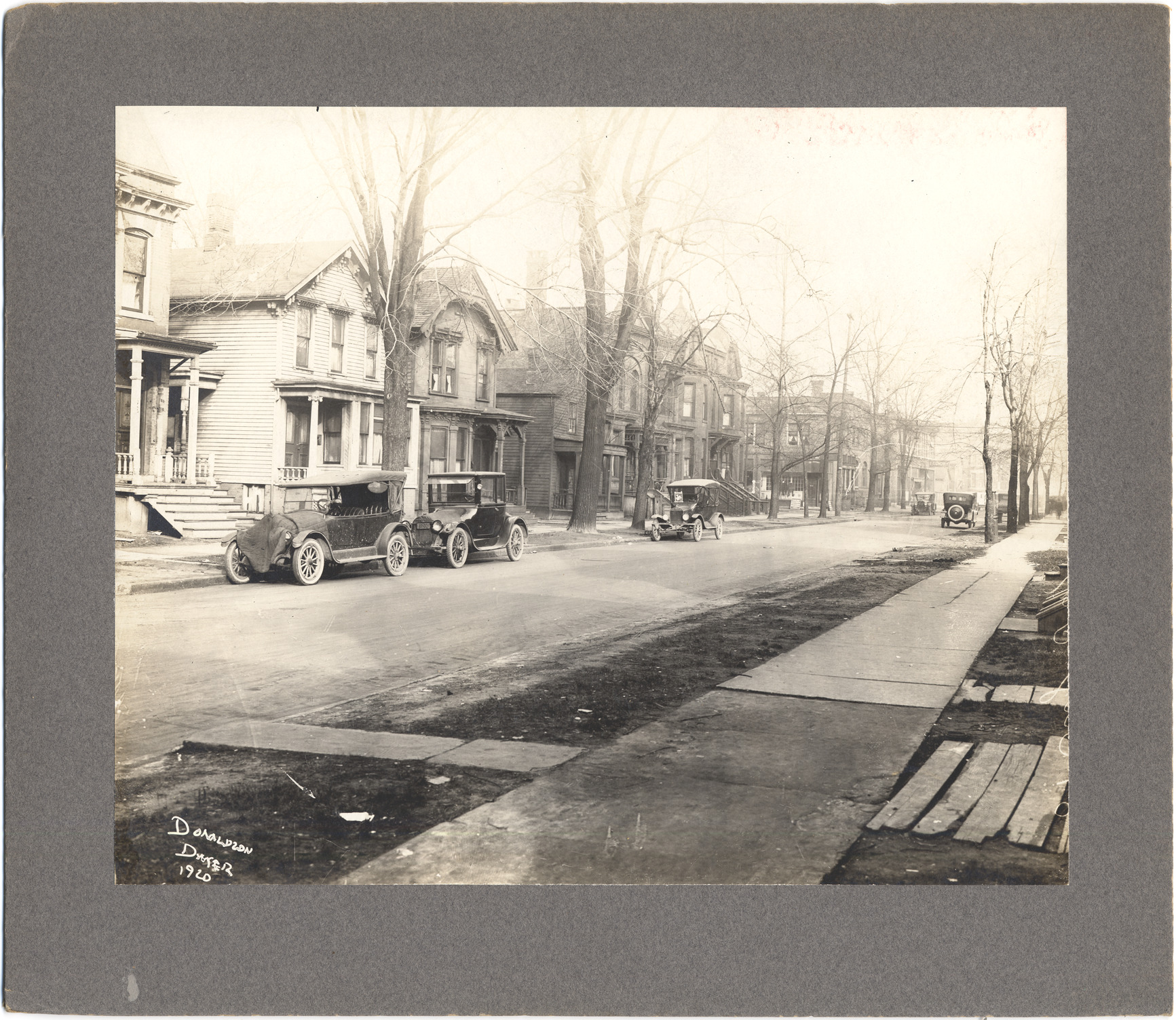 Houses viewed at an angle across paved street; brick commercial building at next corner with tailor. Cars parked along curb. Written on photograph front: "Donaldson Dwyer, 1920." Additional mirror-image text on right edge cut off and not legible. Typed on label on mat back: "Elizabeth St. East between John R. and Brush. 89 (247) Elizabeth East."
