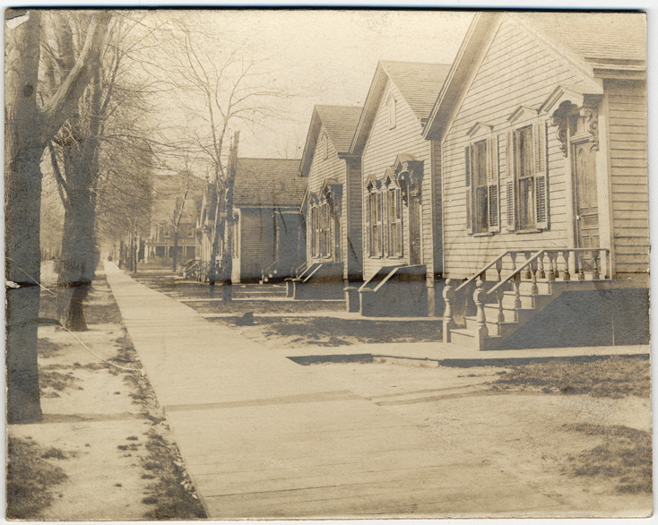 One and two-story houses on Fourteenth Street with wooden sidewalk in front. Handwritten on back: "Apr. 20th 1903. M. Hayse case. In front of 224 14th Ave. There had been a new walk put down."