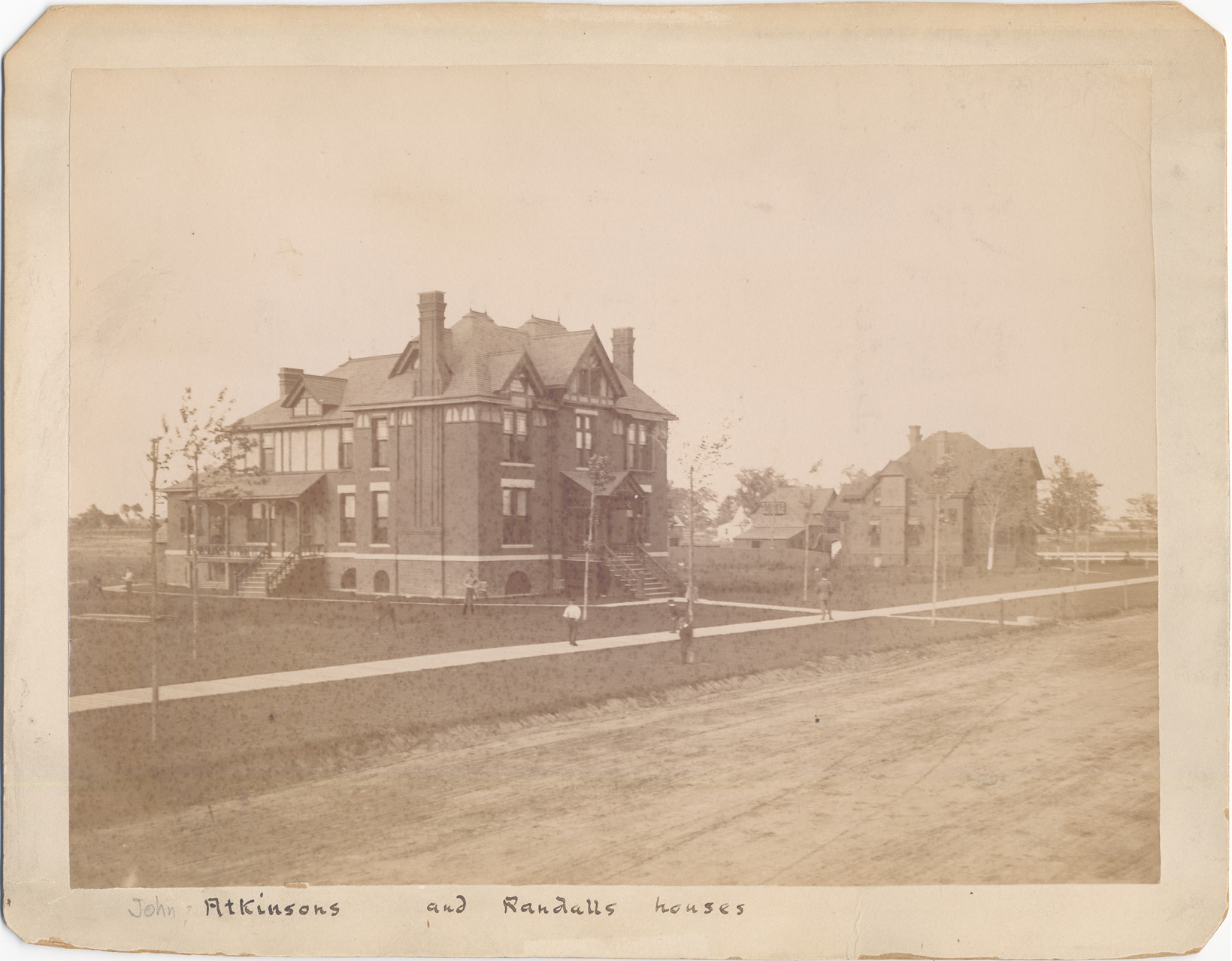 Large cross-gabled three-story brick house, located on Grand Boulevard. Small front porch and large side porch, some decorative half-timbering on upper portion of house. Similar house on right side, both with very large yards. Some people pose near sidewalk. Handwritten on front: "John Atkinsons and Randalls houses."