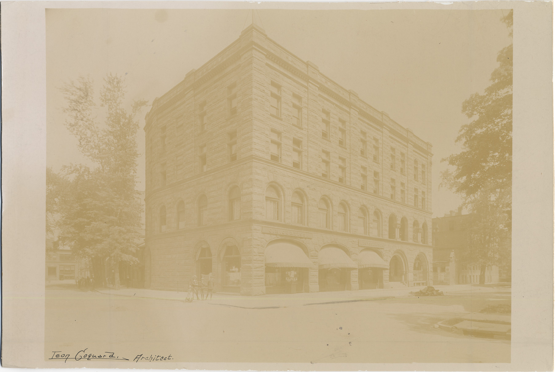 Four-story stone building, with awnings over arched ground-floor windows. Four boys on sidewalk. Signs read: "C.H. Curtiss" and "L. Buysse & Son." Handwritten on photograph front: "Leon Coquard, architect." Handwritten on mat back: "N.E. cor. Wilcox & Barclay Place, 1895. Catholic clubhouse."