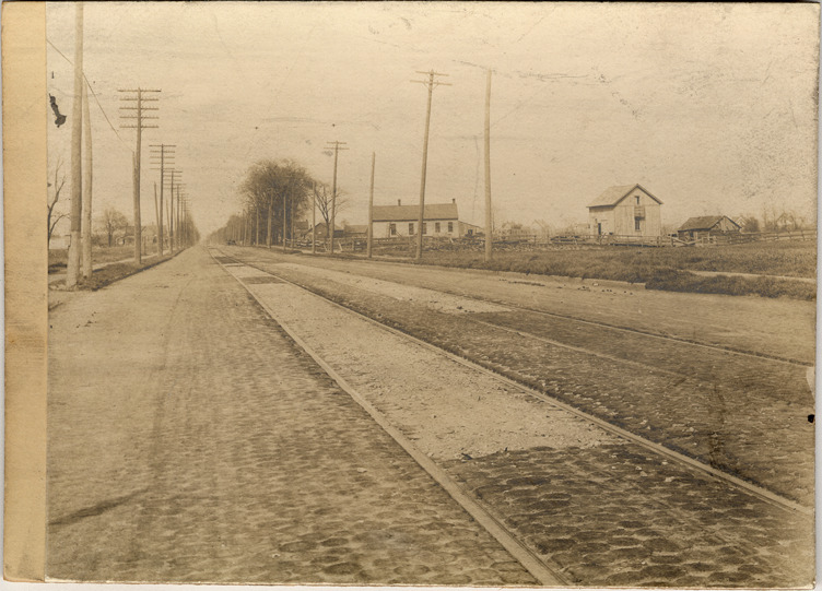 Railroad tracks along cobbled street; houses in the distance. Handwritten on the back: "May 5th 1903. Geo. Goetz. Cor. Stevens & Gratiot Ave. There had been a new pavement put down between the tracks. F.S.Q."
