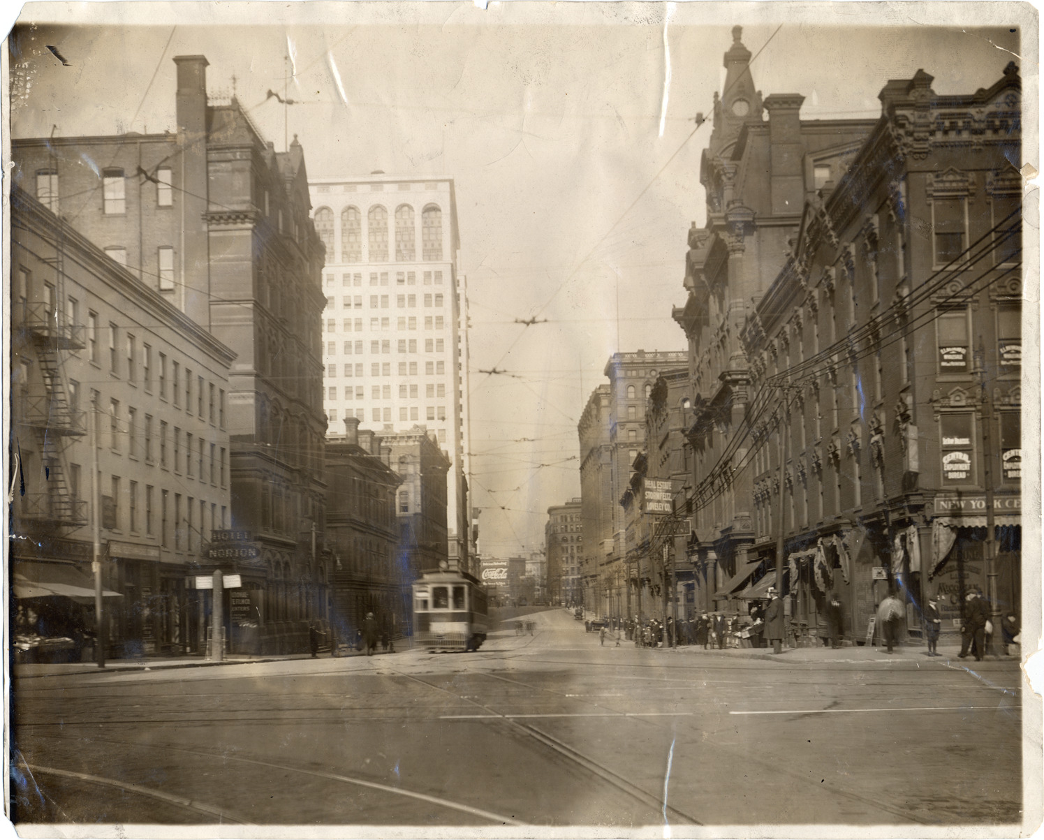 View along Griswold from intersection, with streetcar and parked cars; men lined up on sidewalk. Signs include: Hotel Norton; Real Estate - The Stormfeltz, Loveley Co.; Central Employment Bureau. Billboard advertising Coca Cola. Handwritten on photograph back: "Griswold north of Jefferson, 1914. Newberry Bldg. on the right." Edges of photograph worn; photograph slightly water damaged.