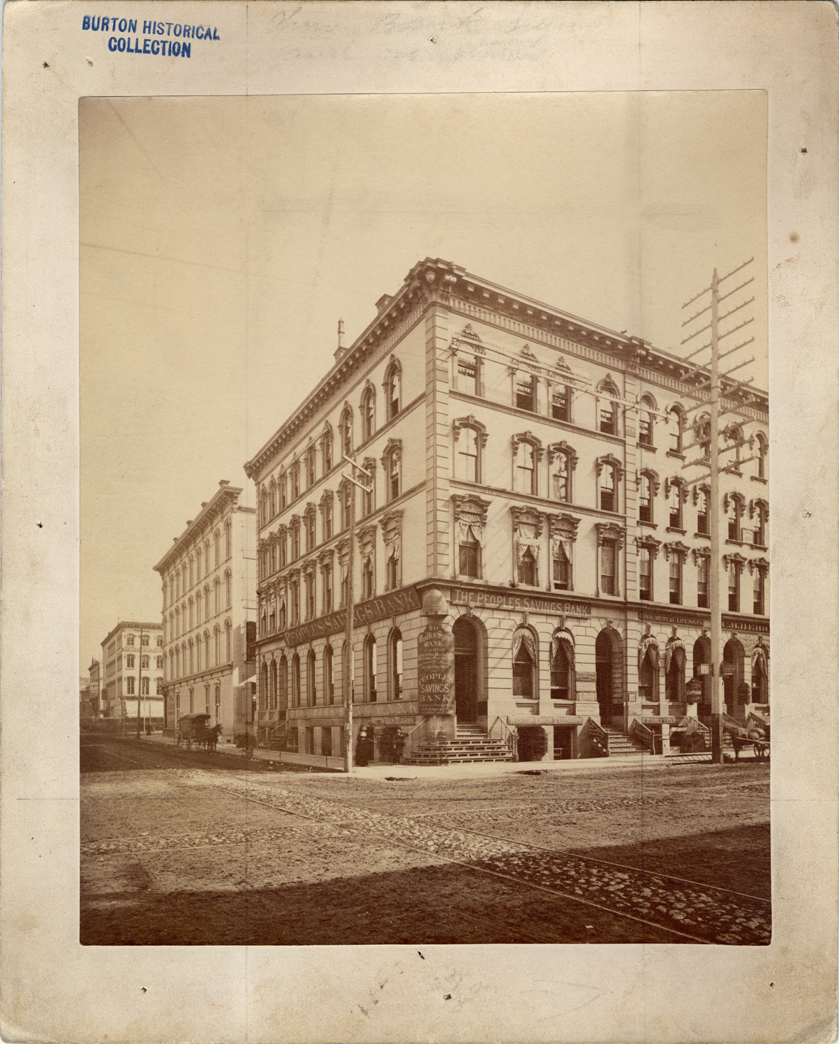 Stone building with arched windows and architectural trim. Signs include: The People's Savings Bank; Western Union Telegraph; Conn. Mutual Life Ins. Co. People by corner; horse-drawn vehicles and bicycle by building. Typed on label on mat back: "Southeast corner Griswold and Congress about 188I, then the location of the People's Savings Bank." Handwritten on mat back: "Old Telegraph Building, site of old Wayne County bldg. S.E. cor. Griswold & Congress, about 1881." Erasing lines on photograph front.