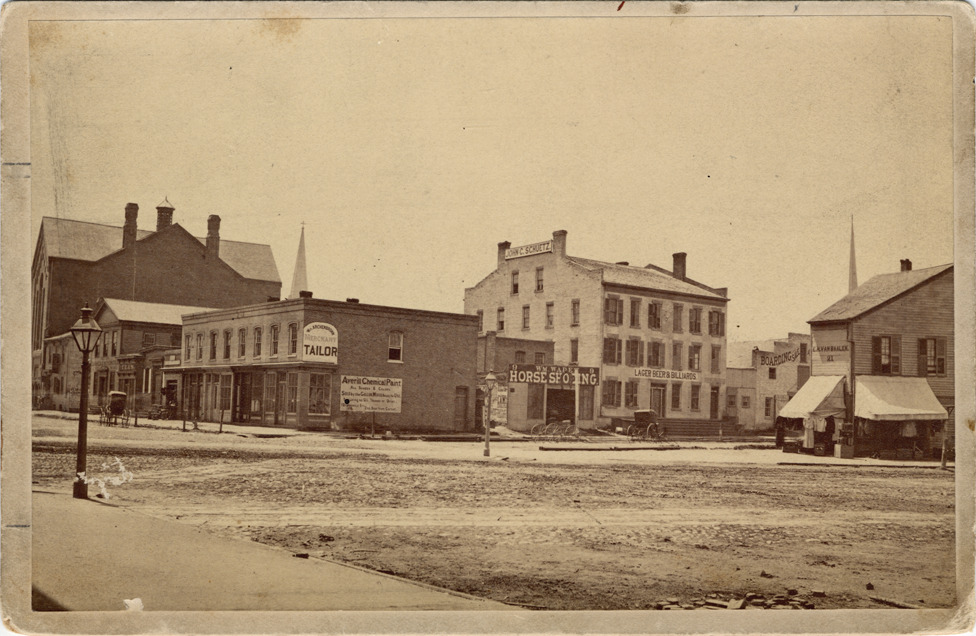 Buildings at the corner of Griswold and Lafayette, viewed diagonally across unpaved intersection. Signs include: Wm. Archenbronn, merchant tailor; Averill Chemical Paint; W. Wade, horseshoeing; John H. Schultz, lager beer & billiards; E.H. Van Baalen. Typed on label on card back: "Southwest corner Griswold Street and Lafayette Boulevard in 1873." Handwritten on card back: "S.W. cor. Griswold & Lafayette, 1873. Site of present First State Bank (1942) (Mr. R. Burton). Purchased Sept. 42 by Mr. Gehrke for construction of Bank Bldg. (Mr. R. Burton). 9253. E709." Edges of card worn; some marks on photograph.