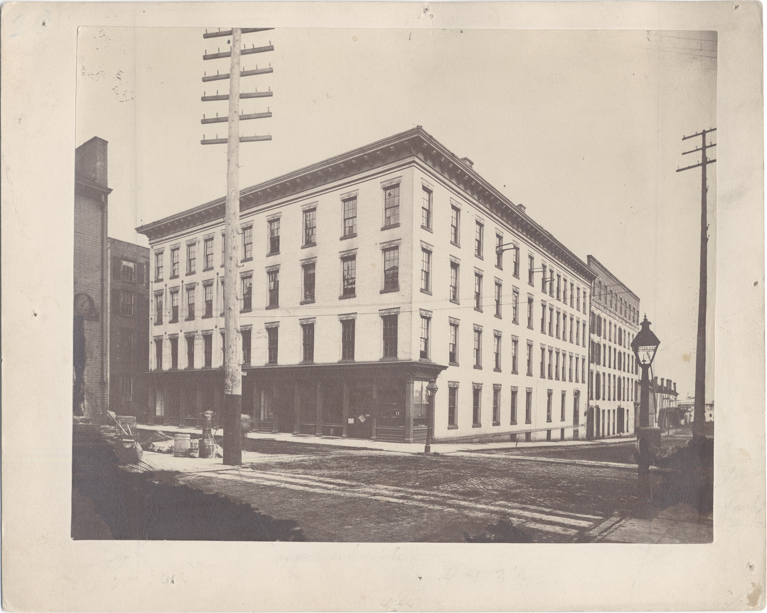 Buildings at Griswold and State, viewed diagonally across intersection. Barrels on corner. Stamped on mat back: "Farmer Bros., photographers, Detroit, Mich." Handwritten on stock back: "S.E. cor. Griswold & Woodbridge. About 1881." Lines drawn on photograph and erased.