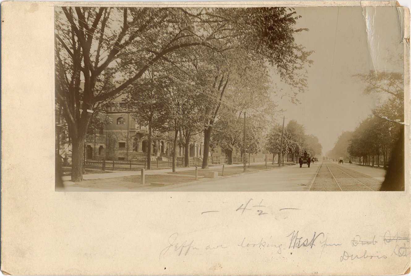 View along street, with glimpses of houses through trees. Horse-drawn carriages, streetcars, and pedestrians on street. Handwritten on mat front: "Jeff. Ave. looking west from Dubois, Det." Handwritten on mat back: "S.W. cor. Jefferson & Dubois. c. 1895." Photograph torn and pasted down in folds; mat torn.